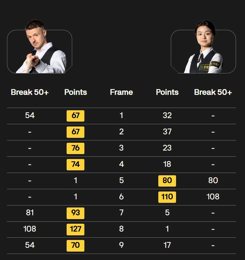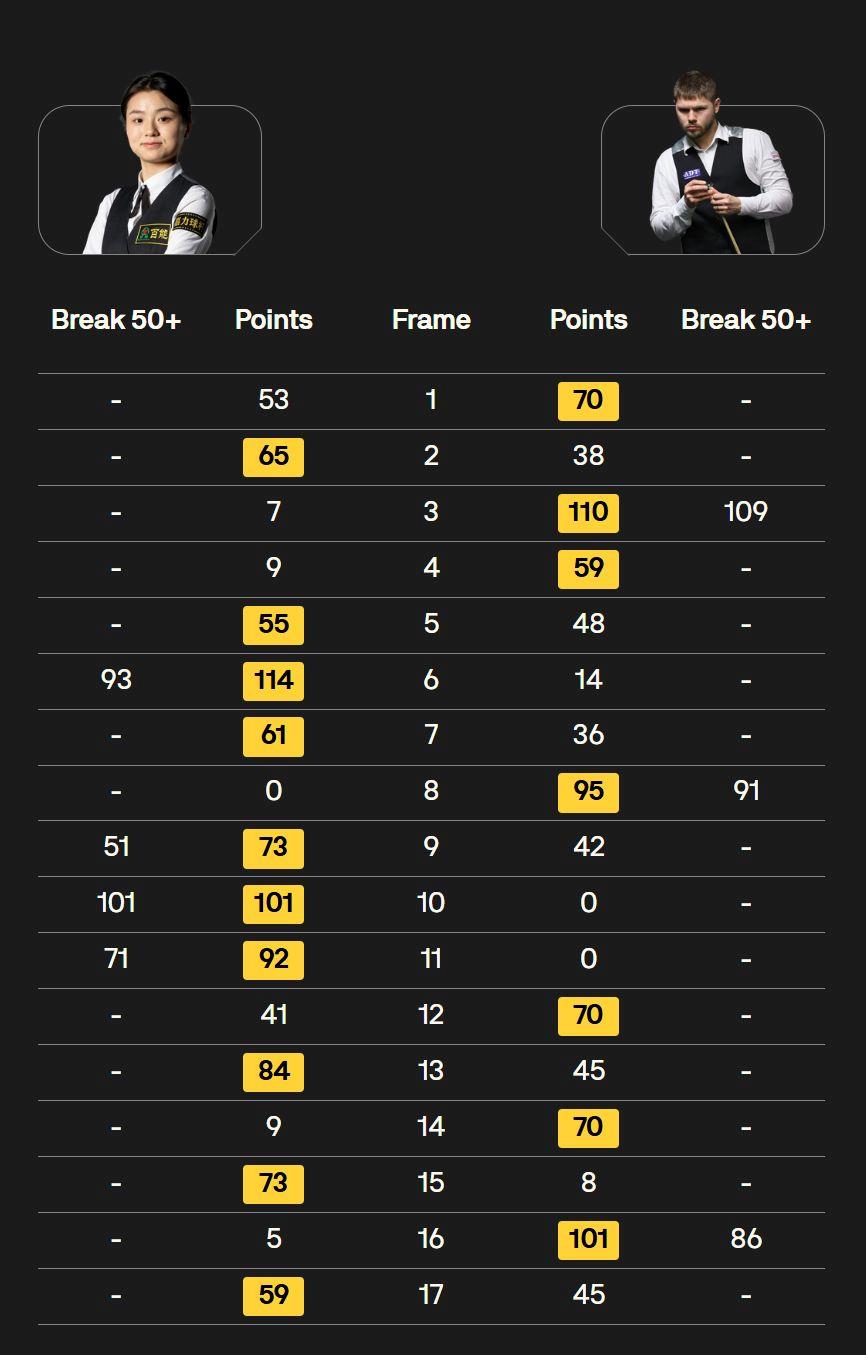 在首轮比赛中,她便以单杆101分、总比分10-7战胜英格兰选手丹尼尔·沃默斯利,成为首位在世锦赛资格赛长局制比赛中获胜的中国女选手,实现了历史性突破。
