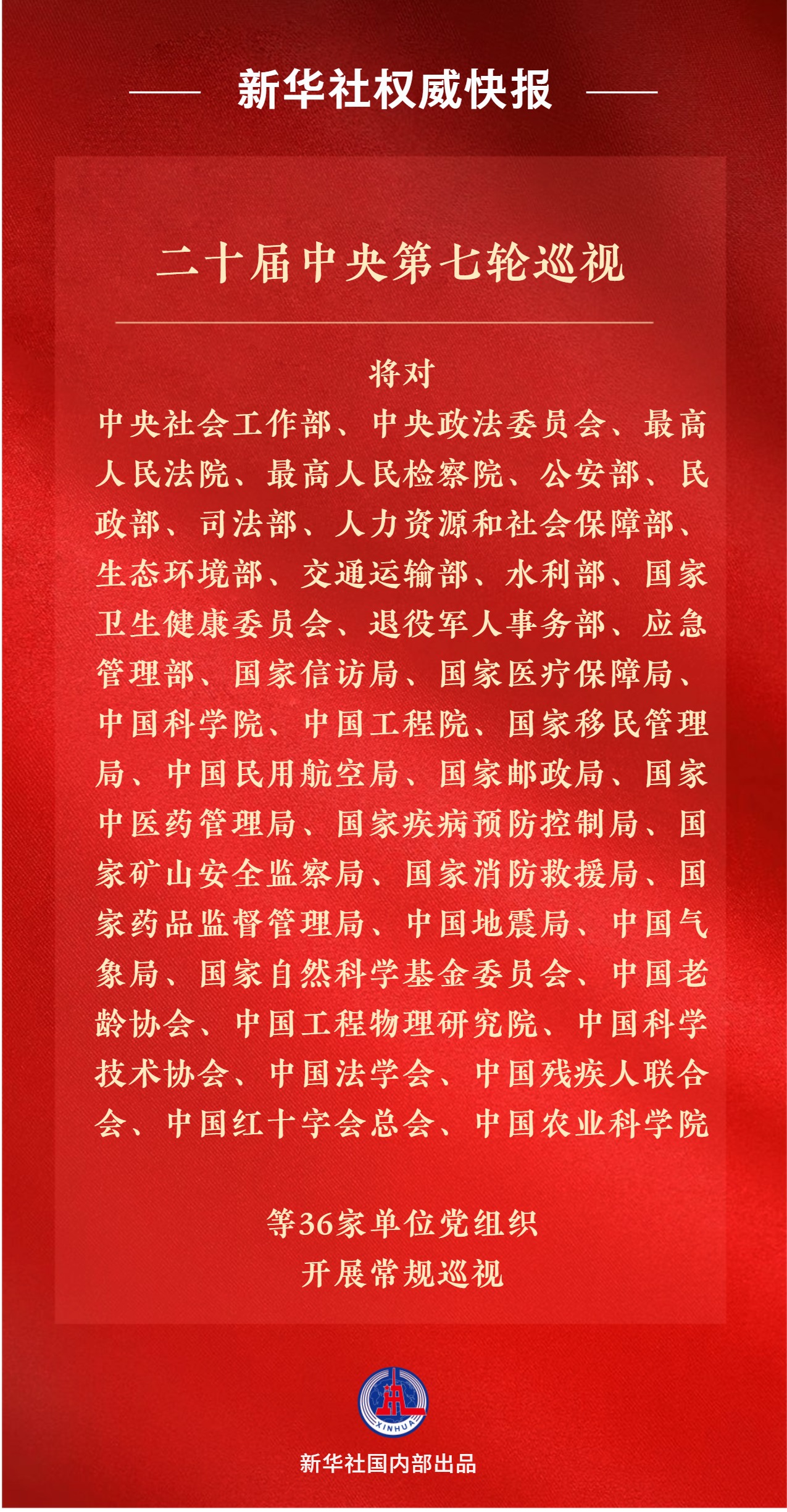 经党中央批准,二十届中央第七轮巡视将对中央社会工作部、中央政法委员会、最高人民法院、最高人民检察院、公安部、民政部、司法部、人力资源和社会保障部、生态环境部、交通运输部、水利部、国家卫生健康委员会、退役军人事务部、应急管理部、国家信访局、国家医疗保障局、中国科学院、中国工程院、国家移民管理局、中国民用航空局、国家邮政局、国家中医药管理局、国家疾病预防控制局、国家矿山安全监察局、国家消防救援局、国家药品监督管理局、中国地震局、中国气象局、国家自然科学基金委员会、中国老龄协会、中国工程物理研究院、中国科学技术协会、中国法学会、中国残疾人联合会、中国红十字会总会、中国农业科学院等36家单位党组织开展常规巡视。